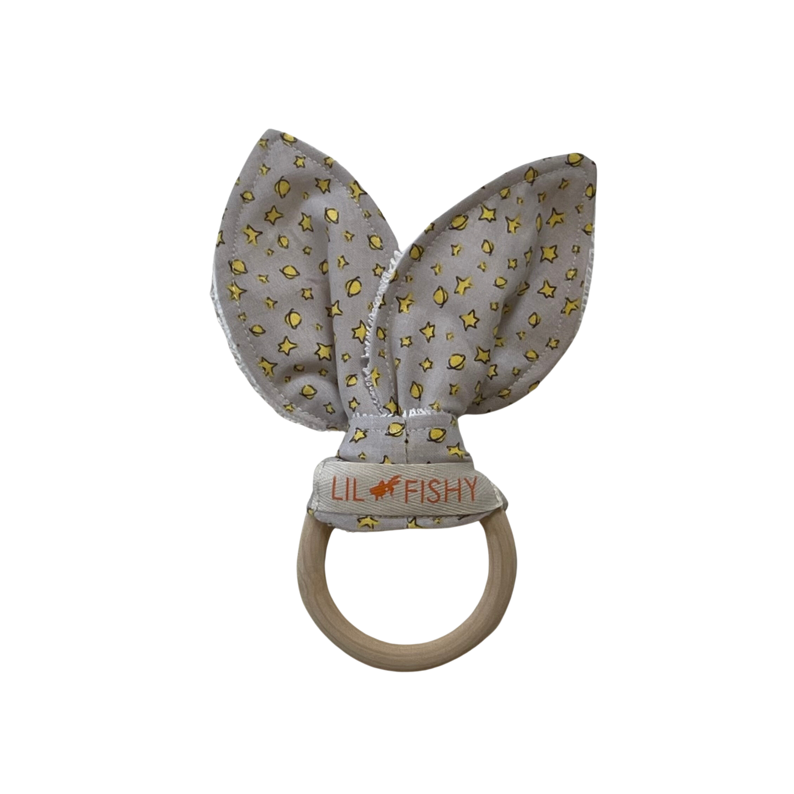 Bunny ear teethers are made with 100% soft cotton print fabric and 100% cotton terry fabric with unfinished natural wooden ring. The little ones can use it while they are teething or playing.