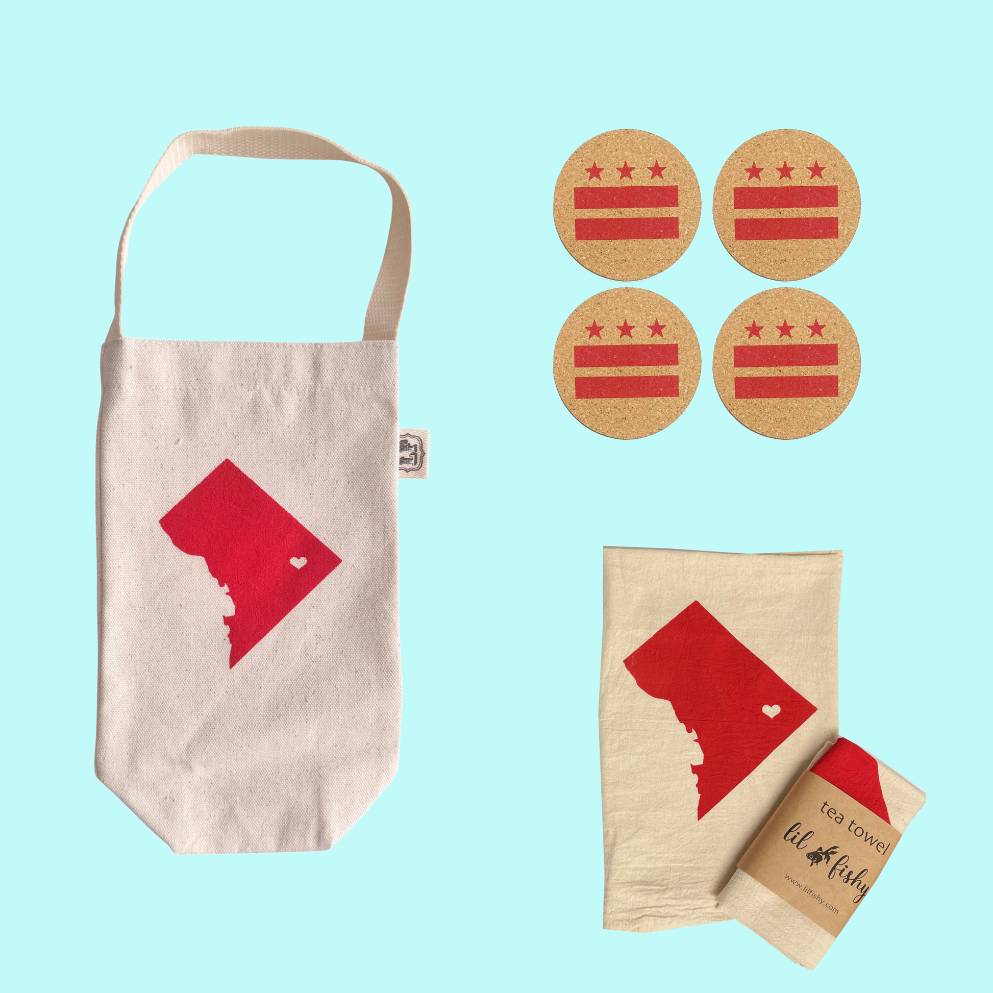 This gift box comes with our silk screened tea towel, wine bag, and coaster set . The box value is $52.00.