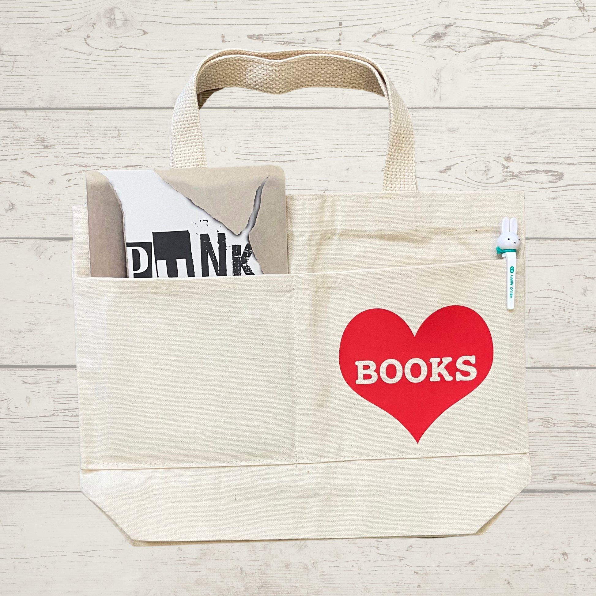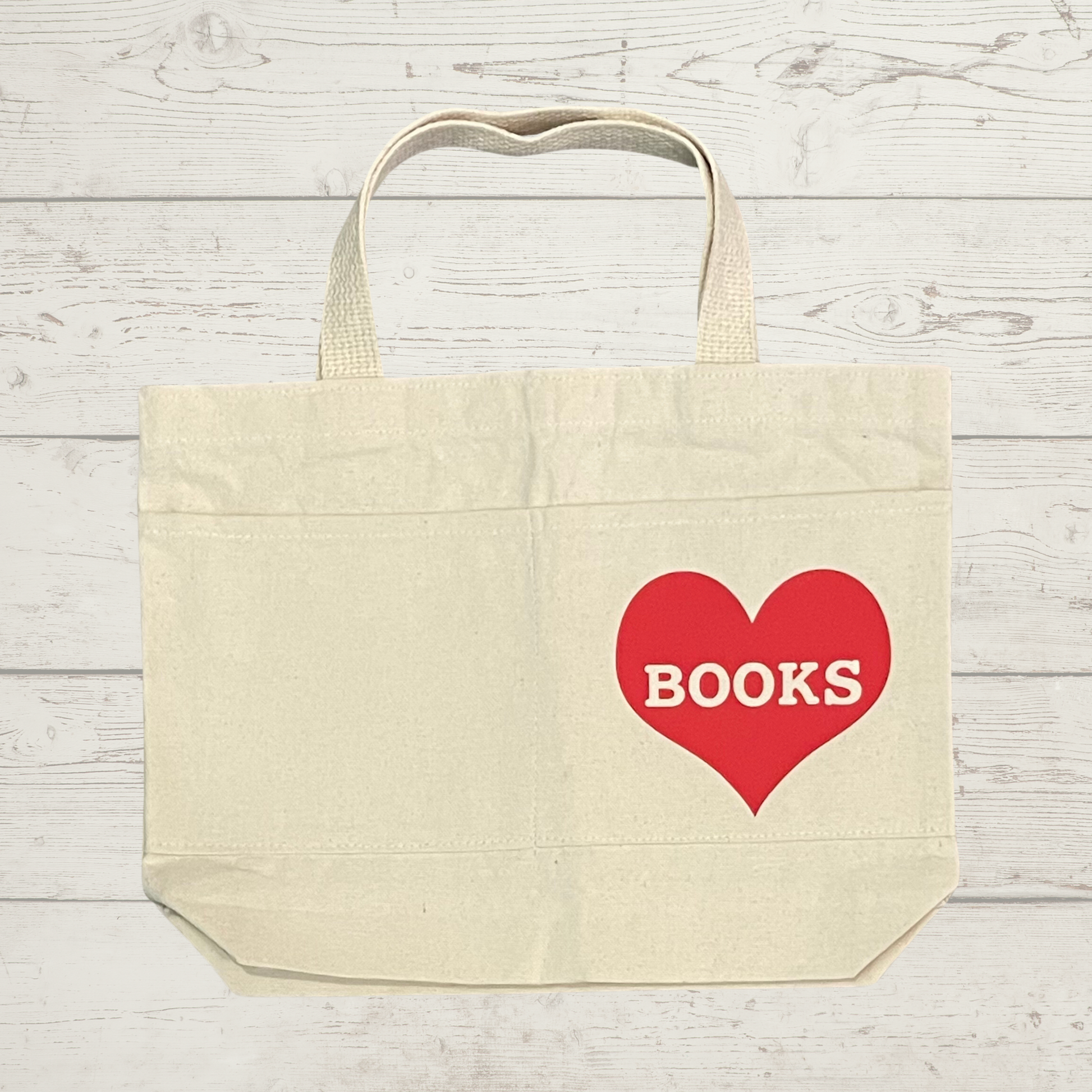 A cool small tote bag with the pockets in the front with image on the pocket. It's good for your kids or even yourself when you go get your books at the library or your favorite bookshops.