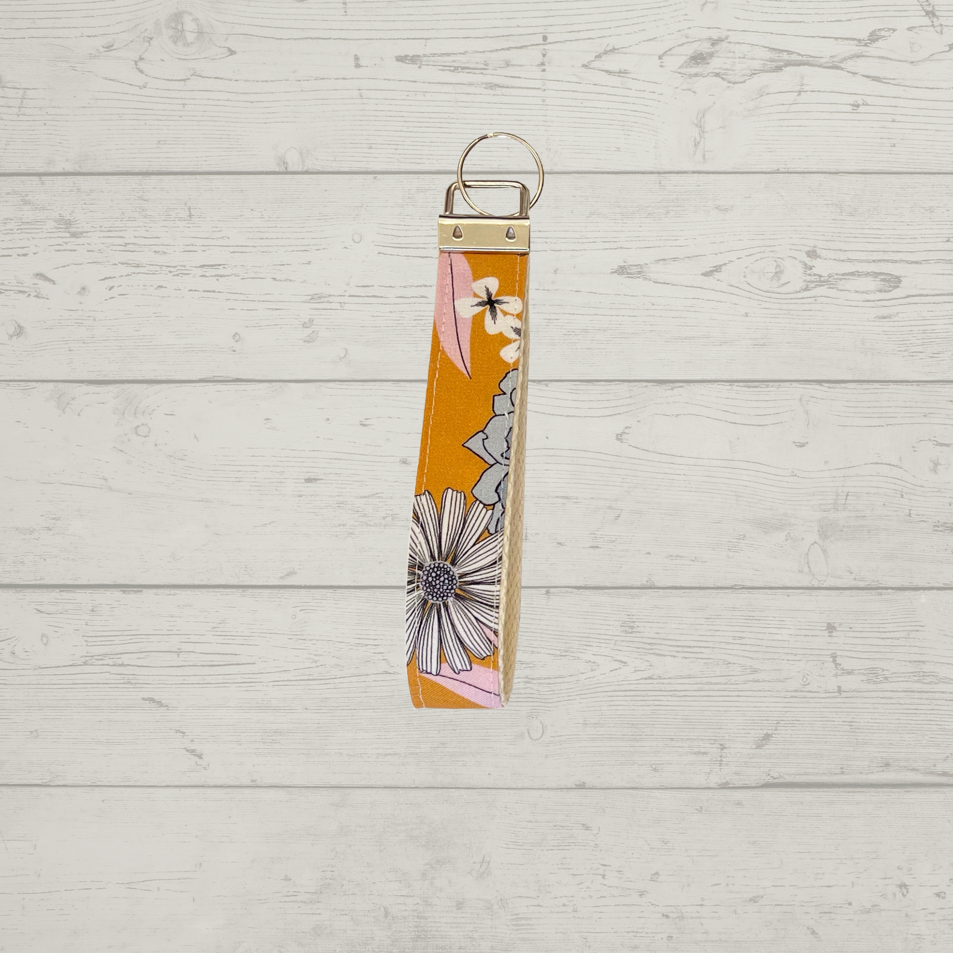 This key fob wristlet is made with 100% cotton novelty fabric and cotton webbings. The hardware is alloy steel with 1" key ring.