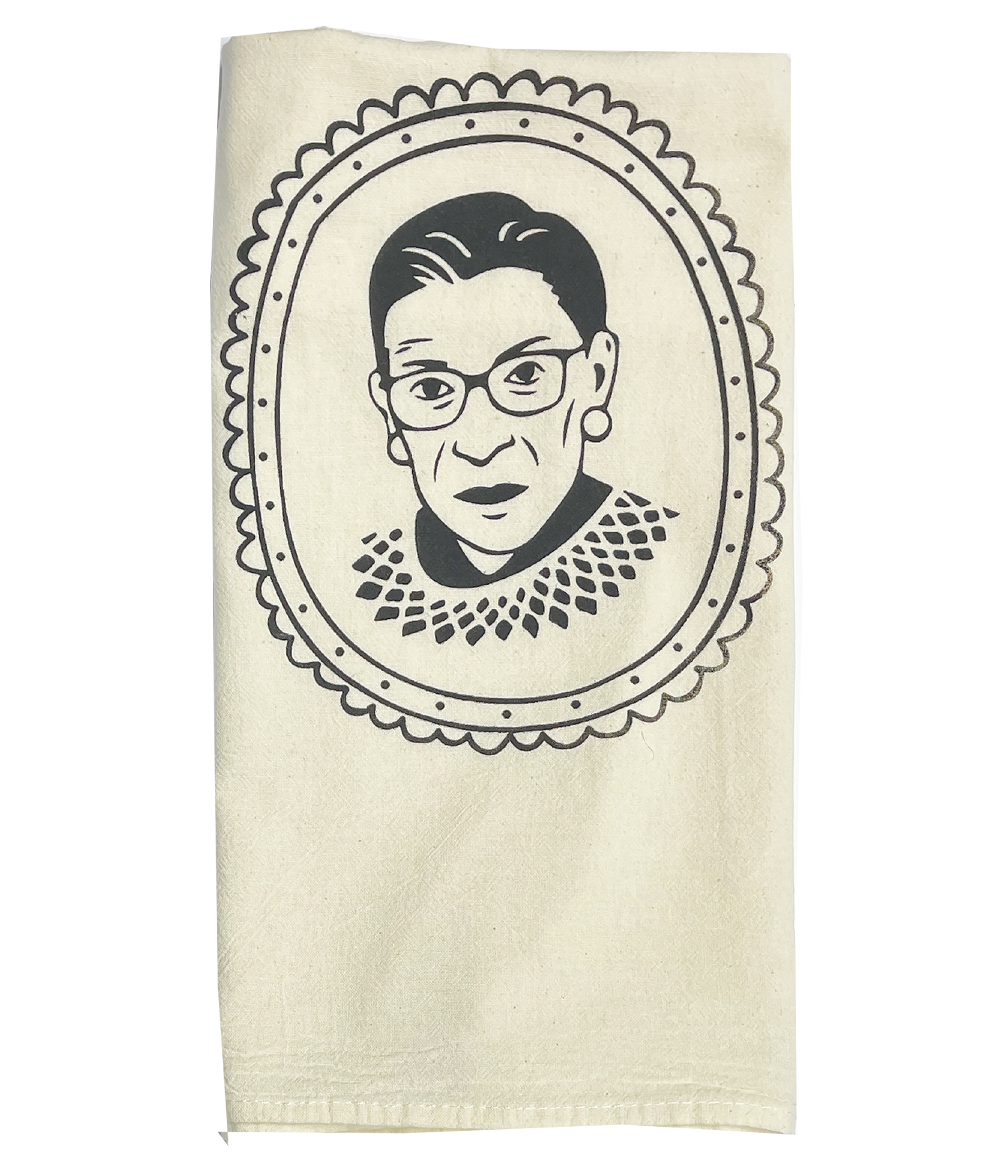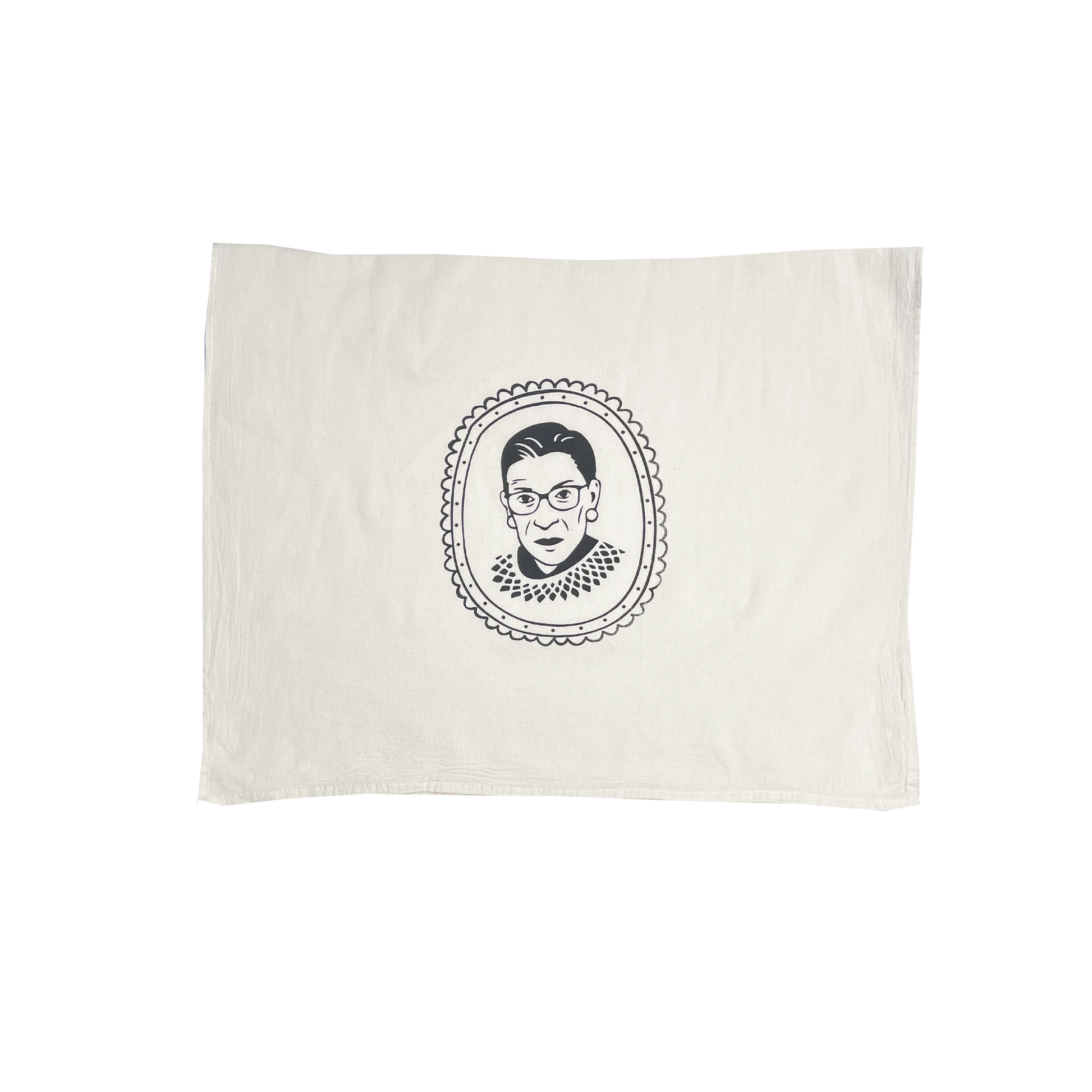 Hand drawn silk screened of our beloved RBG on the natural flour sacks. They are good for cleaning, and kitchen use.