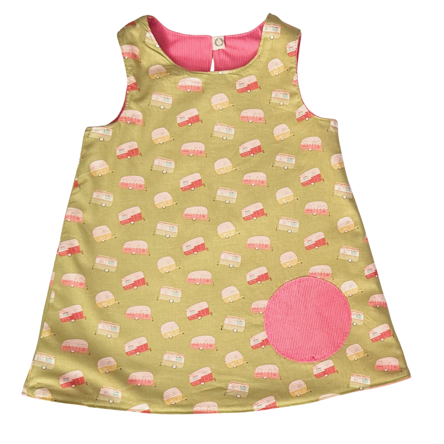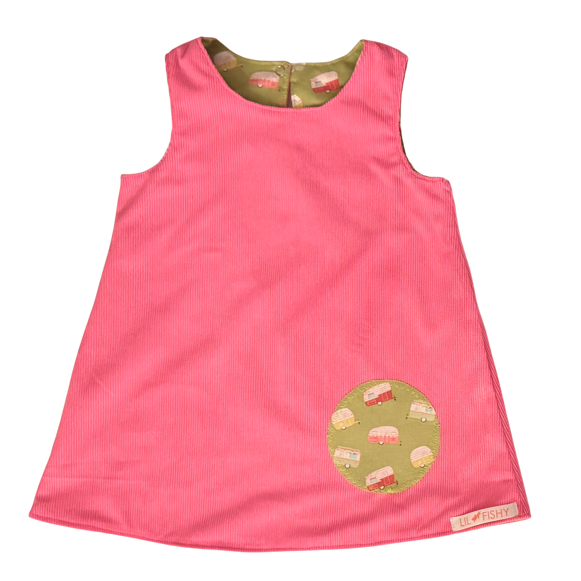 this reversible dress is made from novelty fabric and corduroy with our signature circles on each sides.