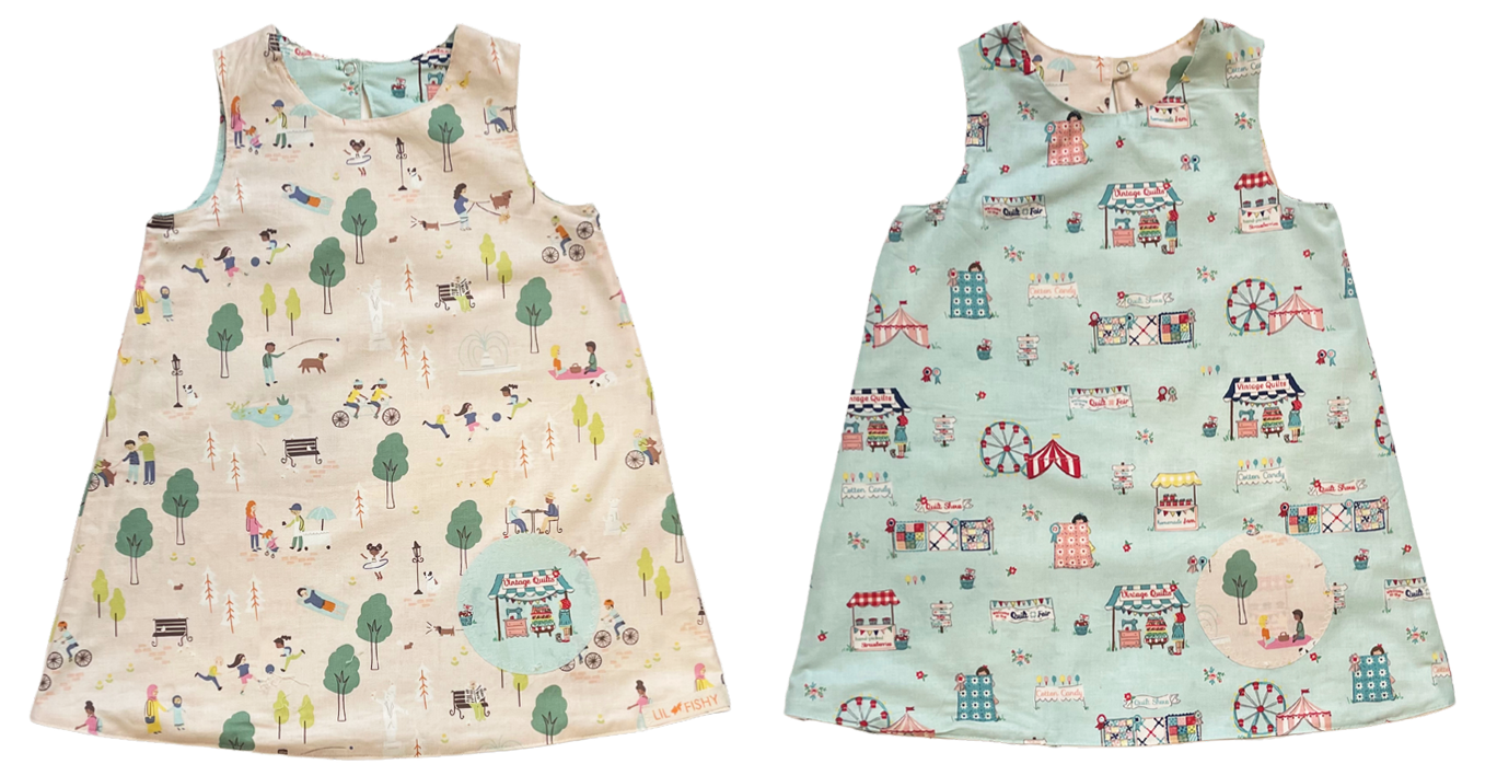 this reversible dress is made from 2 novelty fabrics with our signature circles on each sides.