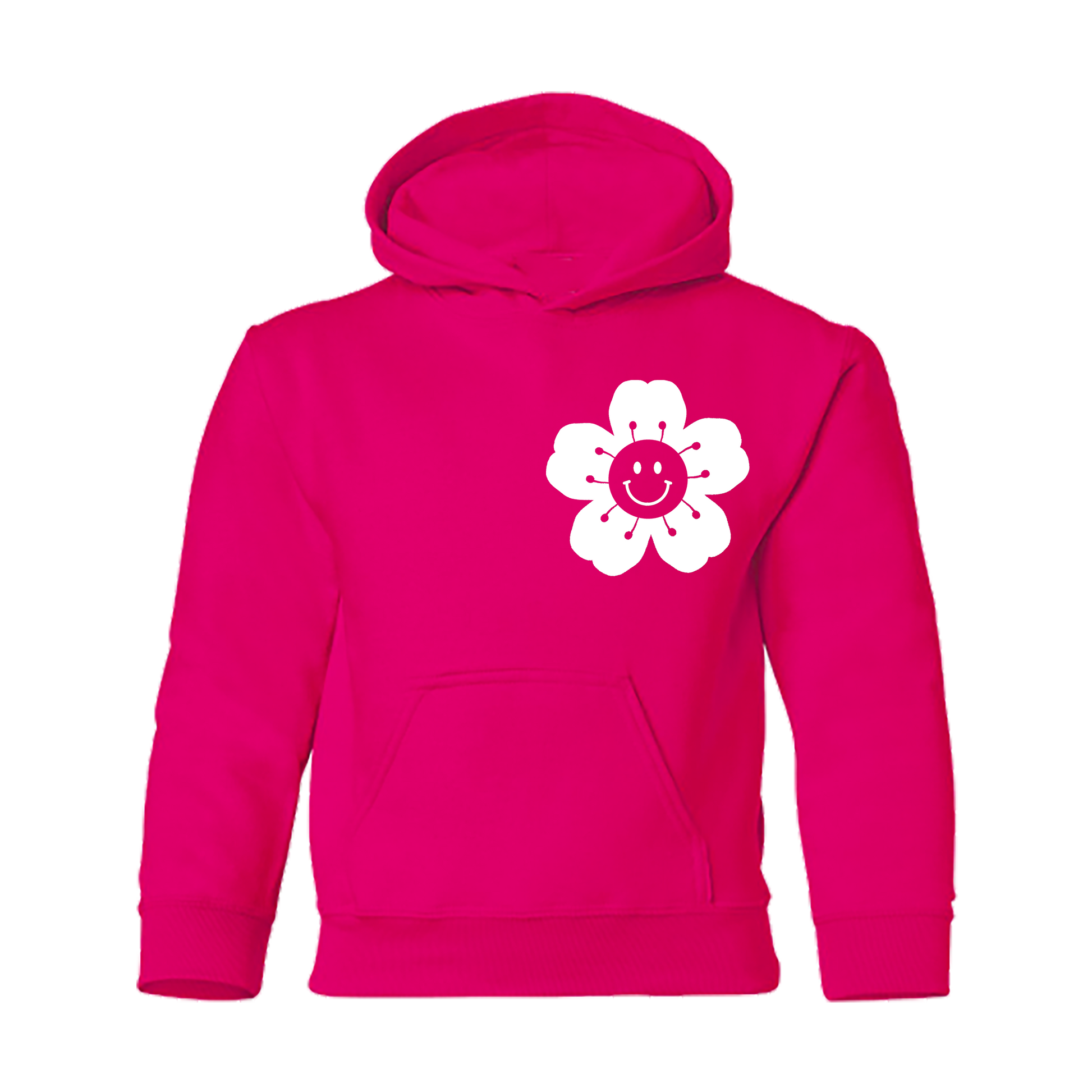 Hoodies with pockets and silk screened our smiley sakura (cherry blossom) in the front.