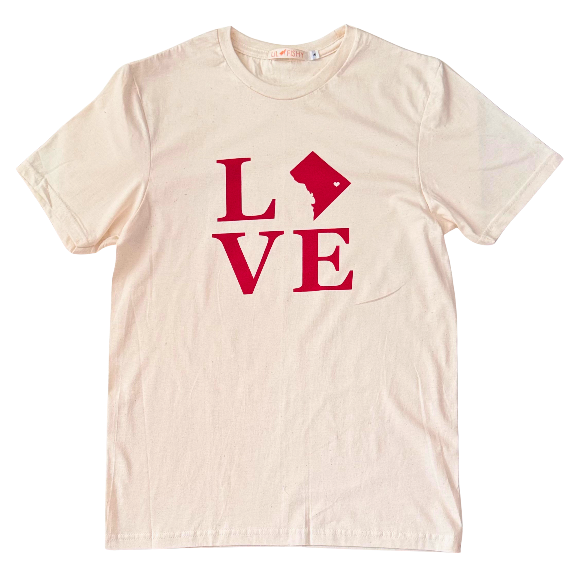 Tee with DC Love silk screen on 100 cotton natural color tshirt.