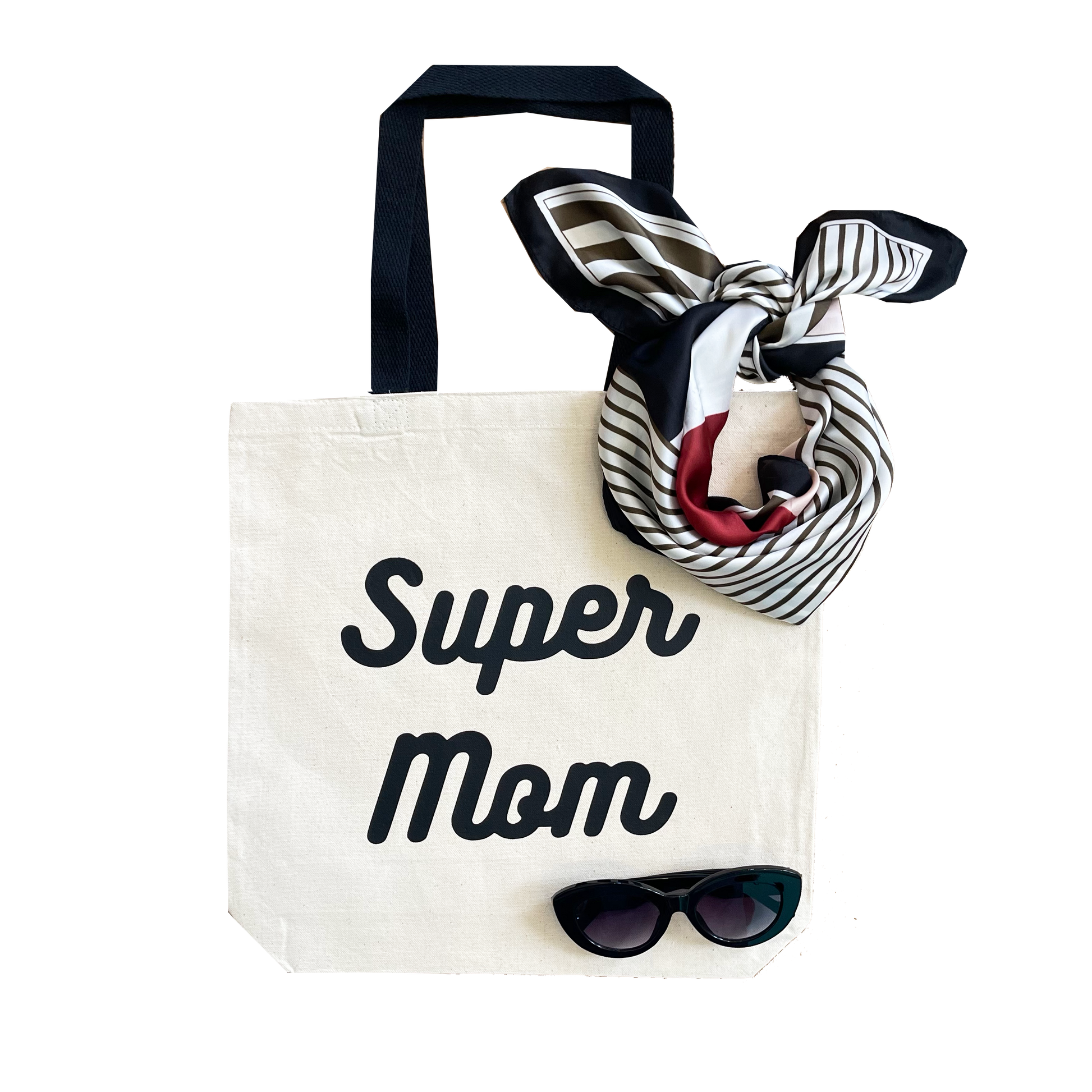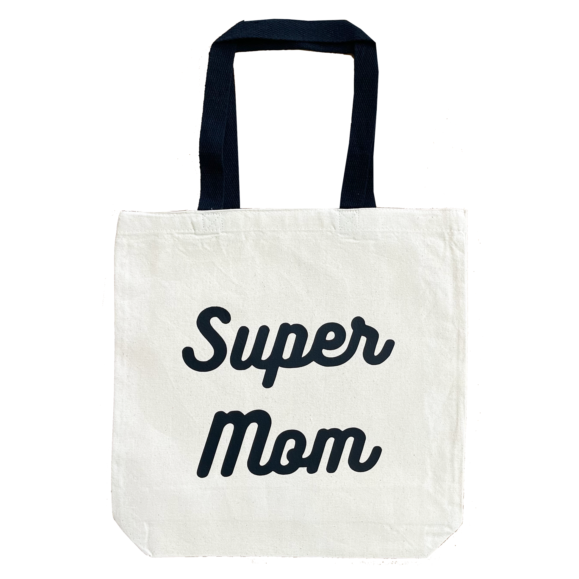 Heat press "Super Mom" on heavy weight canvas tote bag. They are good for moms or mother figures.